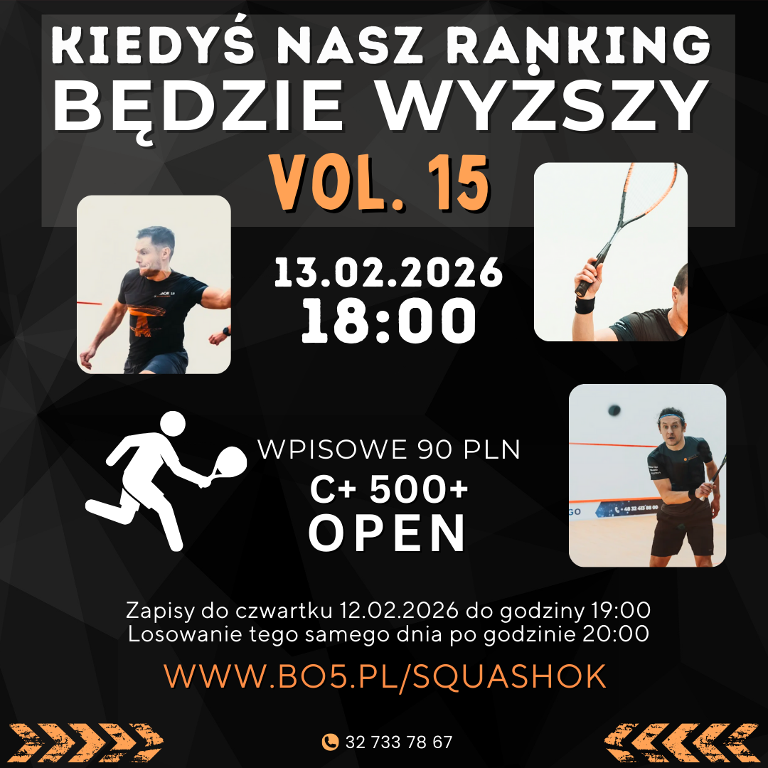 Zapraszamy na turniej Kiedyś Nasz Ranking Będzie Wyższy v15, w którym wziąć udział mogą osoby z rankingiem nie wyższym niż 500 (czyli miejsca 500+) wg PZSQ.